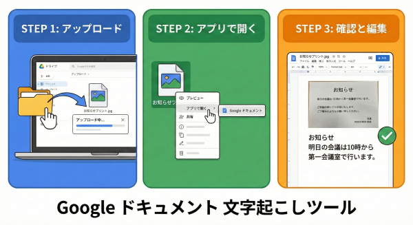 そんなときに役立つのが、Google のGoogleドライブ+Googleドキュメント を使った文字認識機能です。